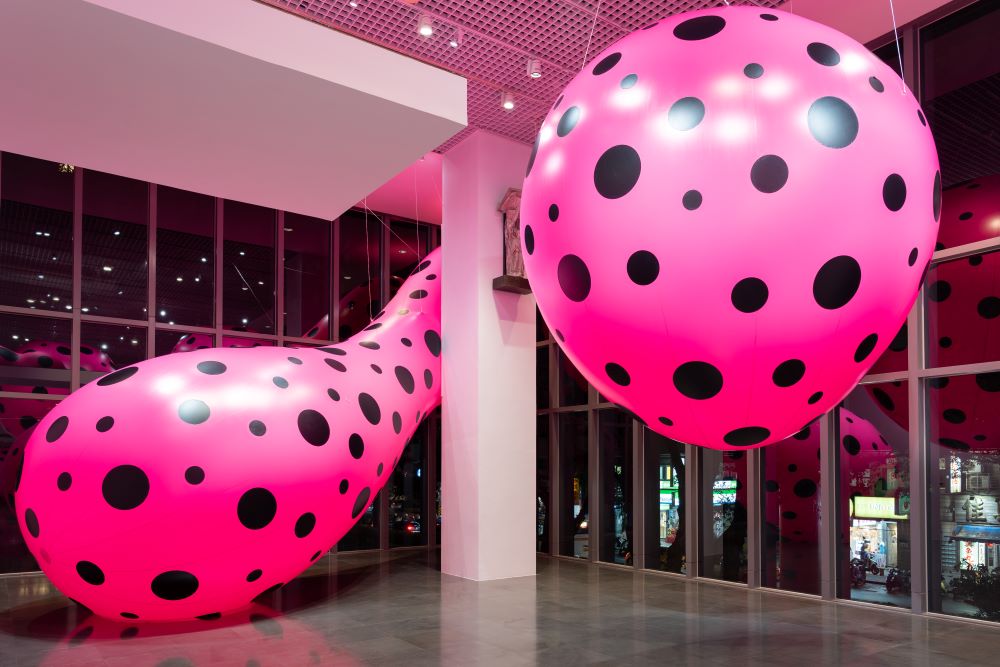展期進入倒數1個月,為回饋觀眾,北師美術館將於4月第1週開始,每周六延長開館至晚上8:30,讓觀眾體驗草間彌生的夜間魔力!2樓挑高展廳的重點展品—《圓點的強迫妄想》巨型裝置,夜幕降臨時映照著周圍的透明落地窗,搖身一變成為巨大的鏡屋,巨型粉紅螢光氣球的倒影好似在展廳中自行增生,構成虛實交錯的游離幻境。