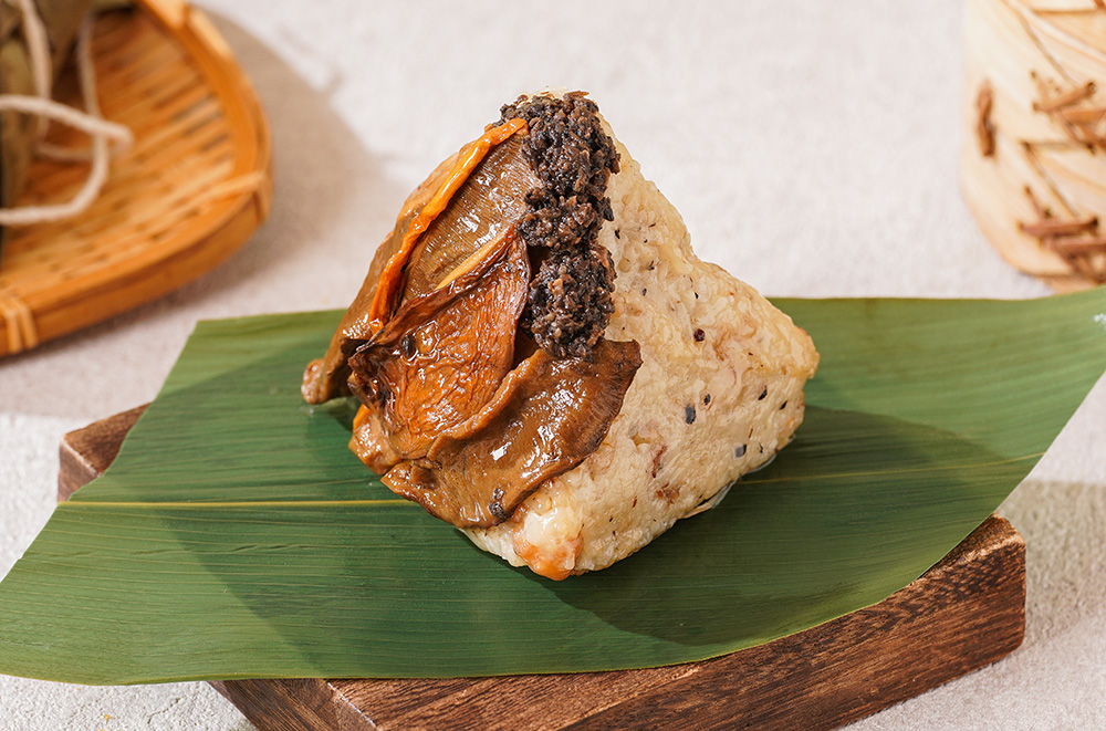 素食消費者可選購的「松露蕈菇五米素粽」以低調奢華的松露和多款蕈菇為主角,搭配黃金比例調和的五穀米與長糯米,口感軟糯彈韌,品味極致的素粽饗味,每顆售價288元。