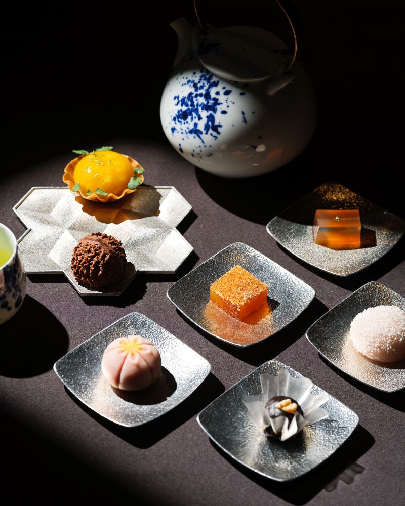 華人待客之道中,餐後遞上點心與水果象徵圓滿,Circum- 延續此傳統,巧妙將和菓子融入其中,為舌尖留下完美餘韻。「鳳黃酥」以法式春捲皮製成的塔殼為基底,內裡包覆由梨、芒果、酸桔製成的果醬晶球,晶球內藏焦糖卡士達醬,外酥內滑。「楊桃錦玉羹」選用新鮮楊桃,經鹽、甘草、山楂醃漬風乾後,燉煮成鹹楊桃湯,甘甜微鹹。「金棗辣椒軟糖」靈感來自客家桔醬,金棗製成法式軟糖,外層裹上宮保椒與燈籠椒辣椒粉,再輕沾糖粉,甜中帶辣。「擂茶焦糖練切」外層細緻原味豆沙包裹擂茶豆沙、流心海鹽焦糖醬,綿密細滑。「草莓優格巧克力大福」外層大福皮裹上白巧克力碎,內餡為希臘優格及草莓,酸甜爽口。「麵果核桃酥」以外形似水果的傳統麵果為靈感,其製作工藝被列為非物質文化遺產。此款茶點麵皮加入可可粉,內餡包裹核桃,口感樸實醇厚。「南棗核桃糕」靈感源自傳統南棗核桃糕,桂圓棗泥拌入威士忌與核桃碎,置於糯米紙上,甜中帶醇。