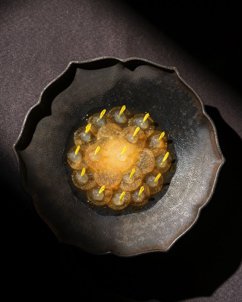 靈感源自杭州經典浮水魚丸,風味一路往南延伸至台南。上桌時鮮香撲鼻,卻不見魚影。主廚 Leo 作為台南女婿,熱愛台南風味,巧妙融合杭州「湯」的鮮醇與台南「丸」的彈嫩,呈現獨具風格的 Leo Style 浮水魚羹。湯底展現杭州風味,以豬骨、白蘿蔔與白胡椒燉煮,滋味清甜,而魚丸則取材自台南浮水魚丸,選用真鯛與干貝製成,外觀如水煮蛋,口感柔嫩似豆腐,卻彈牙嚼勁,搭佐白蘿蔔,鮮甜爽口。