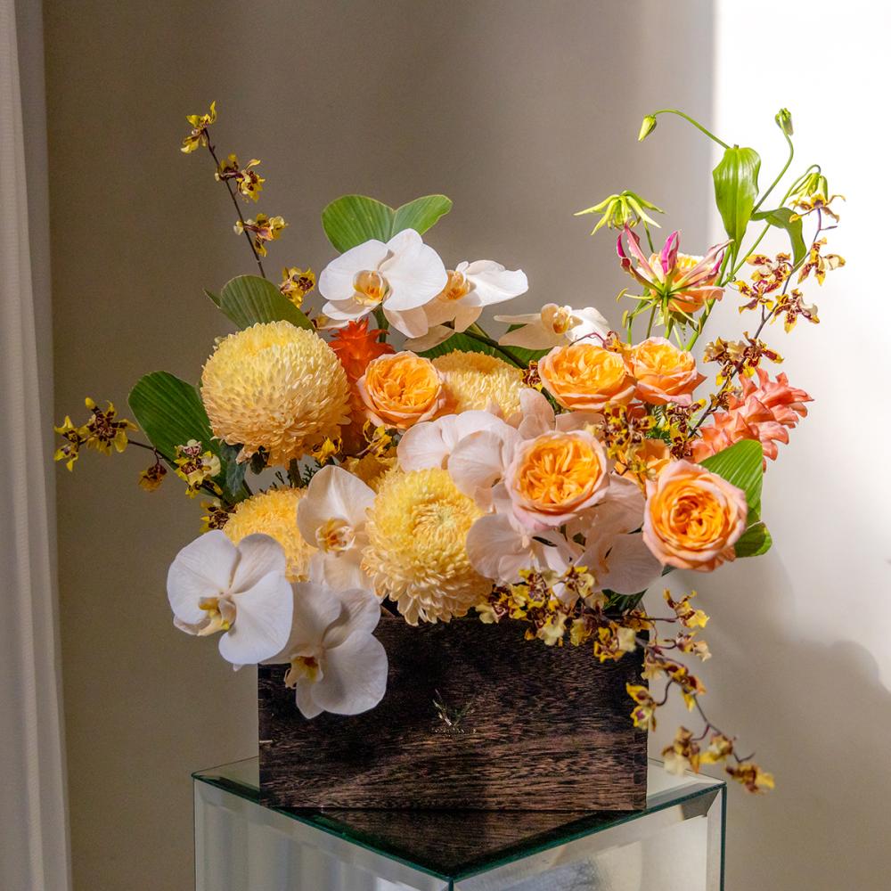 系列花禮共有五款設計,前兩款設計是「雙月提籃花」中的「晴空月」以羽毛太陽花和繁穗莧為主,點綴如秋日晴空的開朗與豐收;「丹華月」以華麗永恆的金色萬代蘭與杏色玫瑰設計,宛若滿月流金。