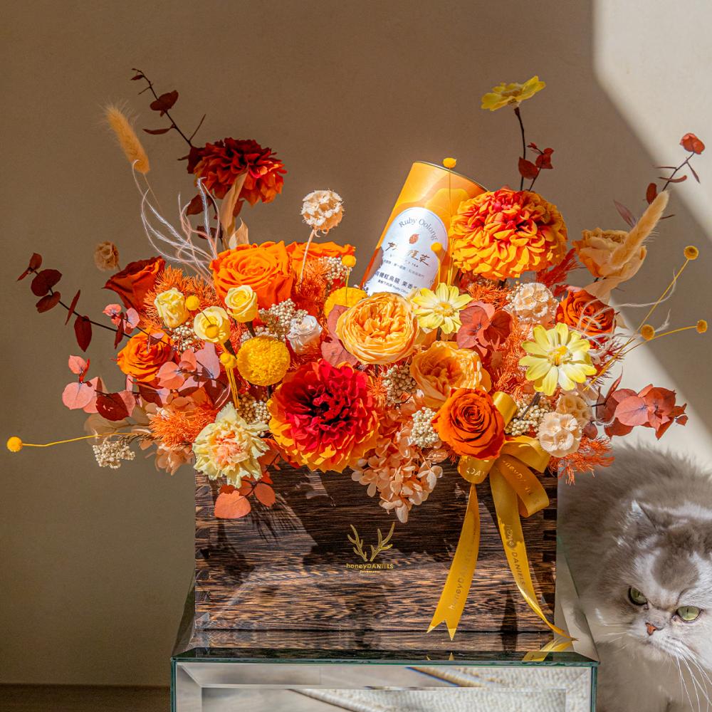 第3、4款設計為「豐收花盒」中的「燦夜花語」,以絢爛玫瑰與火焰百合象徵綻放如夜空中的煙火;「琉光月語」以溫柔的文心蘭、蝴蝶蘭與牡丹菊設計,盛開如琉璃般的光影。最後第5款花禮「永生花」的「盈秋」以金、橙、紅、黃色調的花草交織,濃縮秋日豐盈,象徵永恆的祝福。