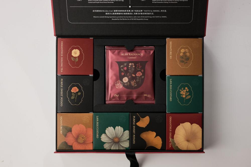 禮盒同時收錄榮獲英國世界柑橘果醬大賽金獎的台灣品牌「Keya 柯亞」獨家研製的「金柑芒果」果醬,結合台南芒果、金棗與桶柑風味,展現台灣風土與國際品質。搭配台灣精品茶葉「雨曦黑鑽石」,由屢獲特等獎肯定的連勝茶廠以獨家烘培技藝融合烏龍茶與紅茶,茶湯清香甘潤、韻味綿長。