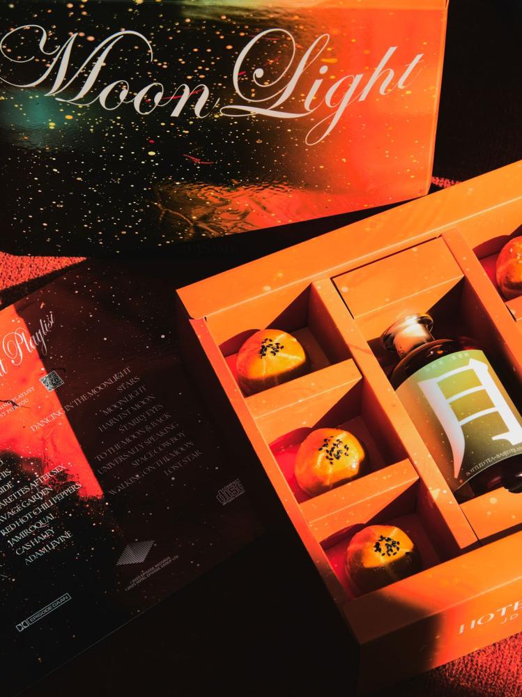 「Moon Light」禮盒外型如同黑膠唱片,融入星空銀河的想像,彷彿邀請你透過美食與音樂,展開一趟中秋銀河之旅。禮盒內附有一張由「The SOCIAL by LayLow」音樂總監訂製的 Spotify 賞月歌單,讓你一邊品嚐美味,一邊沉浸在橫跨黃金年代的優雅樂曲中,享受專屬的「Moon Light」時刻。