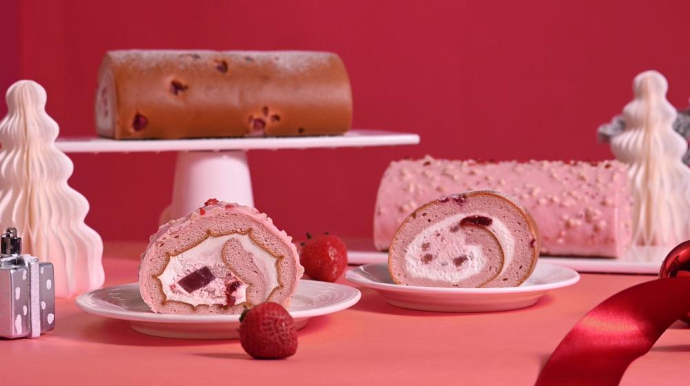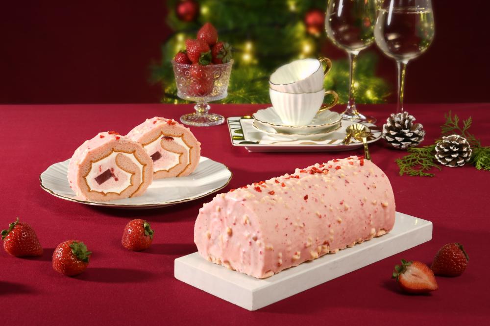 還有一款粉色系生乳捲「戲雪尋莓生乳捲」使用覆盆莓果粒烘烤的粉色泡芙蛋糕($495/18cm),內餡是經典奶霜與草莓凍奶霜的組合,口感輕盈,帶有初戀般的酸甜尾韻。