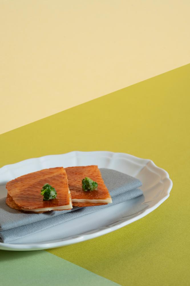 【Bake 烘烤】鴨皮起司薄餅 |以招牌的脆片鴨紙作為饗宴的開端,主廚將高溫處理過的鴨皮細緻烘烤至輕薄如紙,包裹起司片後再次入爐。濃郁的起司與酥脆鴨皮脂香交融,是全新體驗鴨宴的最佳開場。