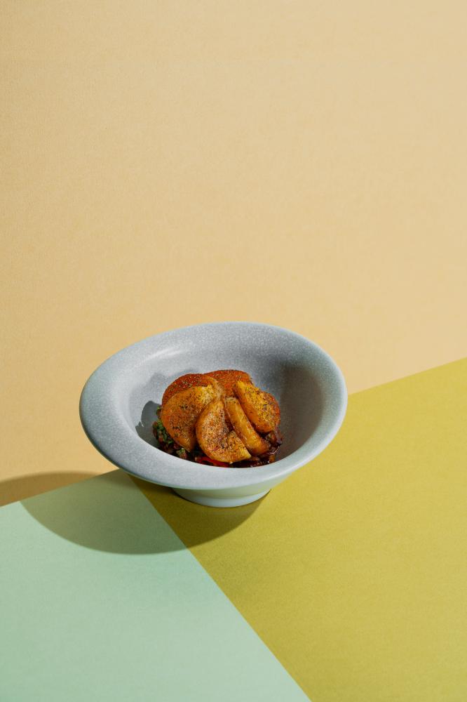 【Wok 拌炒】避風塘鴨鬆馬鈴薯沙拉 |選用櫻桃鴨小翅部位細切成鴨鬆,以避風塘手法大火快速拌炒,鎖住迷人的「鍋氣」。搭配以鴨油慢燉的綿密馬鈴薯與煙燻紅椒粉,風味平衡且極具開胃感。