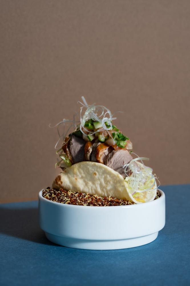 【Roast 爐烤】爐烤鴨胸墨西哥油蔥薄餅 |將爐烤鴨胸轉化為有趣的墨西哥塔可(Taco)形式。鴨胸先以冷鍋慢煎至鴨皮酥脆、肉質粉嫩封存,再包裹入帶有在地氣息的油蔥薄餅。搭配清爽的莎莎醬生菜與小黃瓜,展現鴨胸部位最優雅的風味表現。