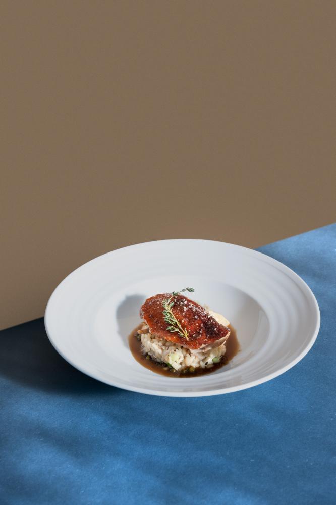 【Confit 油封】油封功夫鴨腿義大利燉米|作為全餐最暖心的核心段落。採用法式經典低溫油封技法,將鴨腿慢煮至肉質柔嫩細緻。底層是以鴨油基底燉煮、包覆飽滿醬汁的義大利燉米,綠胡椒的風味讓濃郁中帶有一抹清香。