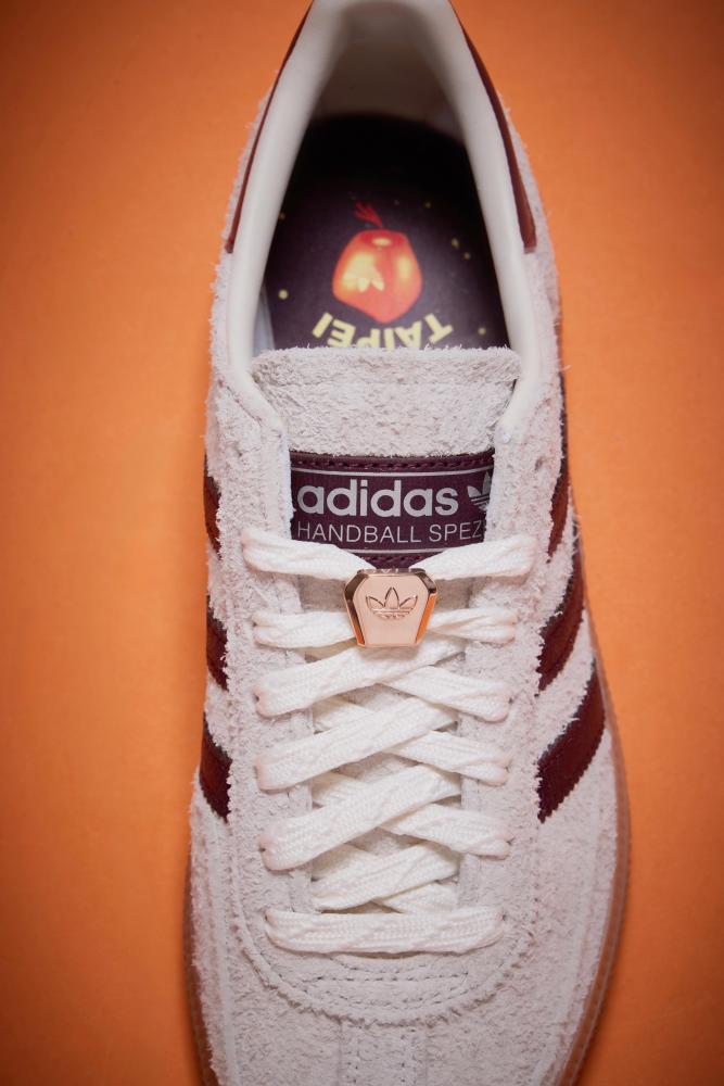 ORI吉NALS 天燈 HANDBALL SPEZIAL鞋款將滿滿幸運巧思融入設計細節,後跟與鞋墊印有天燈與 TAIPEI 字樣,鞋帶點綴金色天燈鞋帶扣飾,象徵好運隨腳而行。配色選用沉穩米灰鞋身搭配焦糖色鞋底,經典三條線以酒紅色呈現,層次分明,低調中展現復古質感。