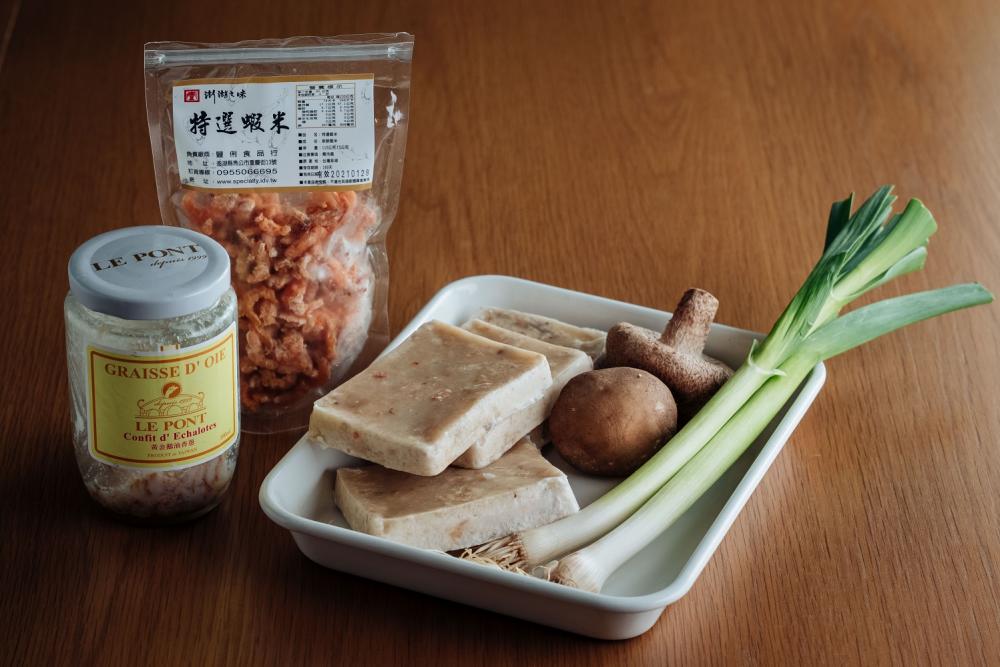 步驟1.蘿蔔糕切條狀,蒜苗白色部份切斜段,綠色部份切末,香菇切片,蝦米先以水泡開。在深鍋中放入鵝油油蔥(也可用一般的油,再加入油蔥酥)。