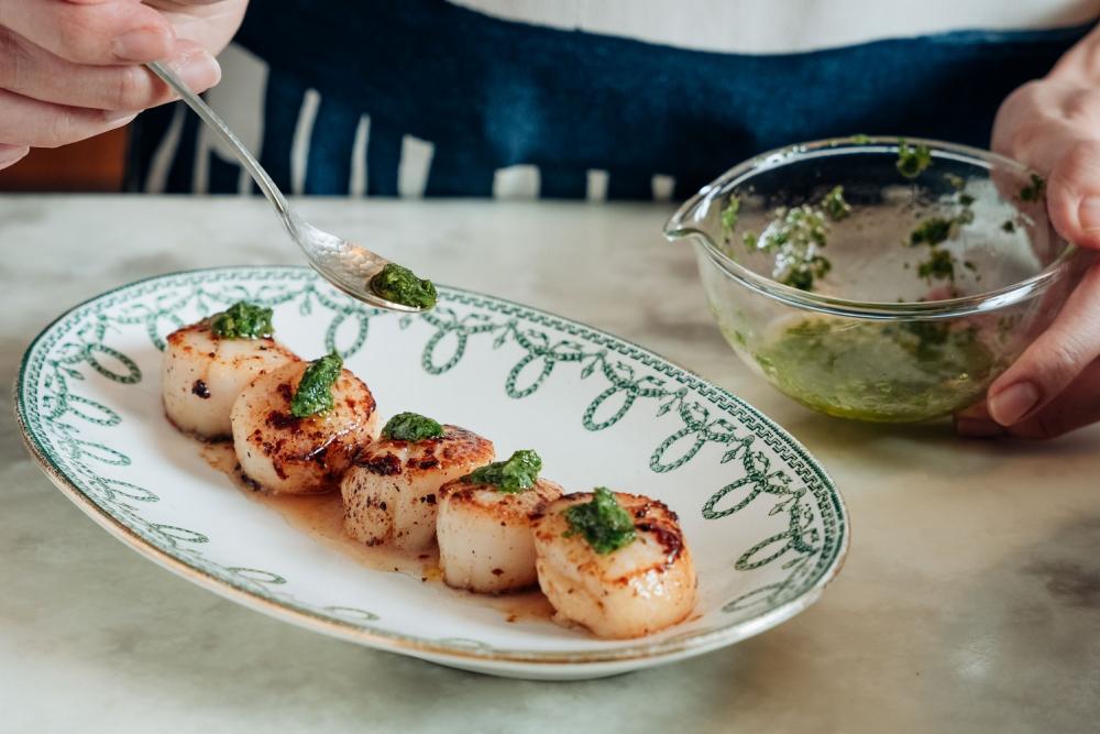 步驟4.裝盤,每一顆干貝上都舀一點點紫蘇醬。