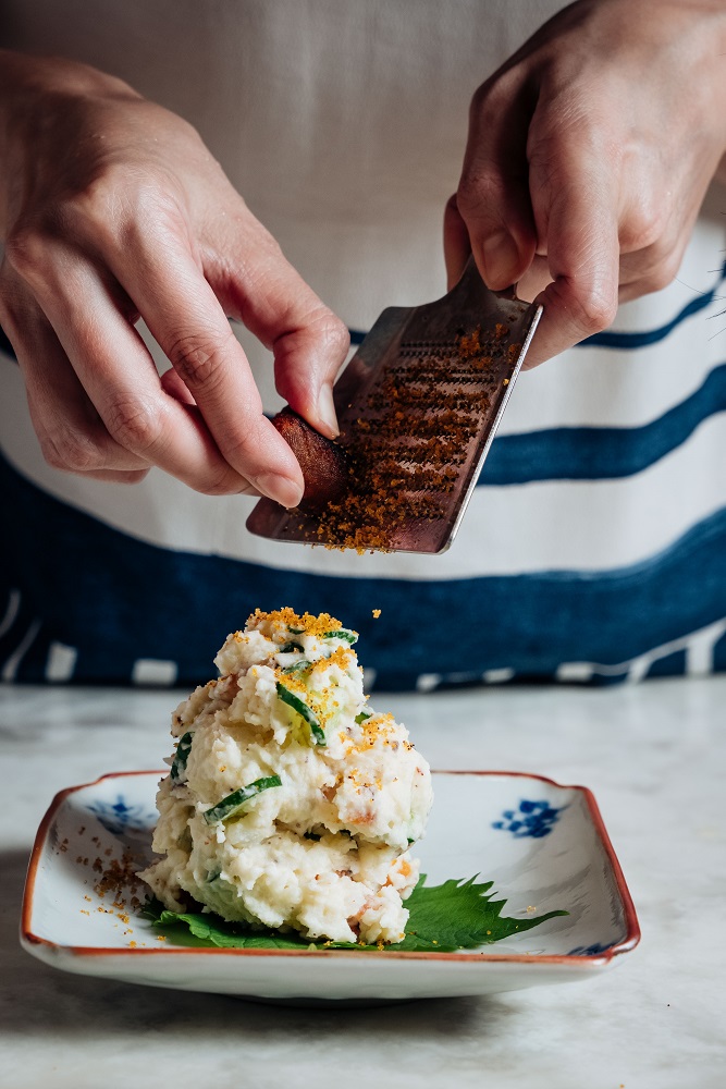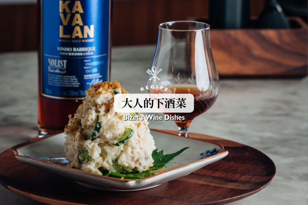 加了烏魚子的馬鈴薯沙拉非常大人味,平時喝多了清酒及白酒,過年不如換個口味,配一杯尾韻回甘的純飲威士忌吧。