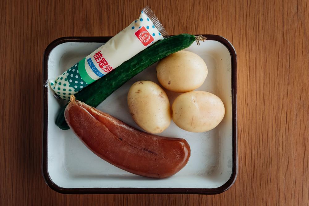 步驟1.馬鈴薯洗淨去皮,放入電鍋以一杯水蒸熟。烤過的烏魚子切小丁塊;小黃瓜切薄片,加一小匙鹽搓一搓去青,靜置10鐘後,將出的水擠出倒掉備用。