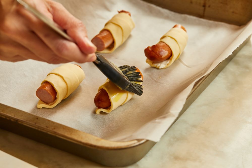 步驟4.在捲好的酥皮表面刷上蛋液,送進烤箱烤15分鐘或烤到上色、金黃即可。