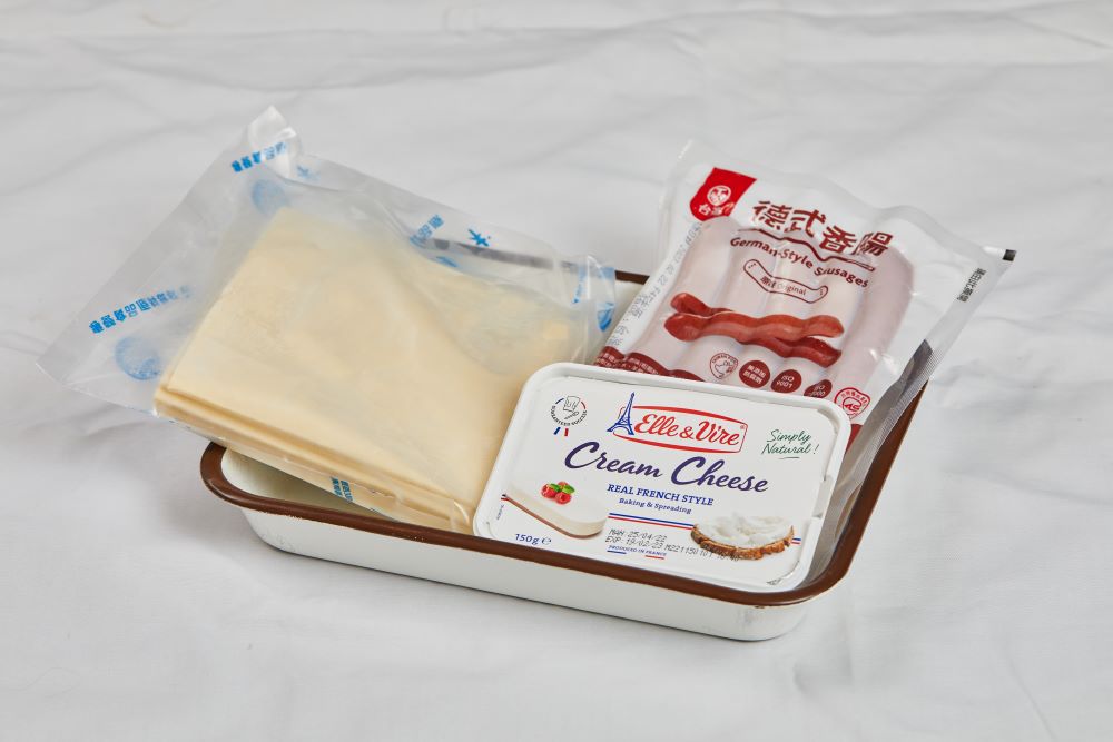 步驟1.冷凍酥皮不需解凍,切成四片三角型;德國香腸切細花,口感較佳;烤箱預熱到200度。
