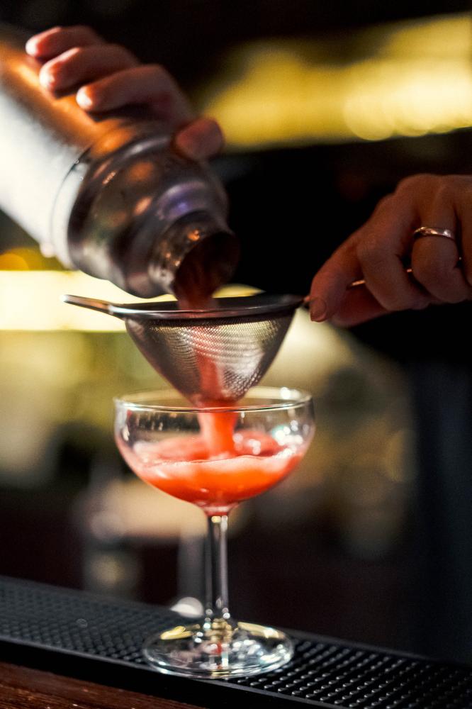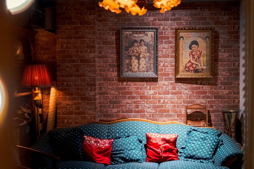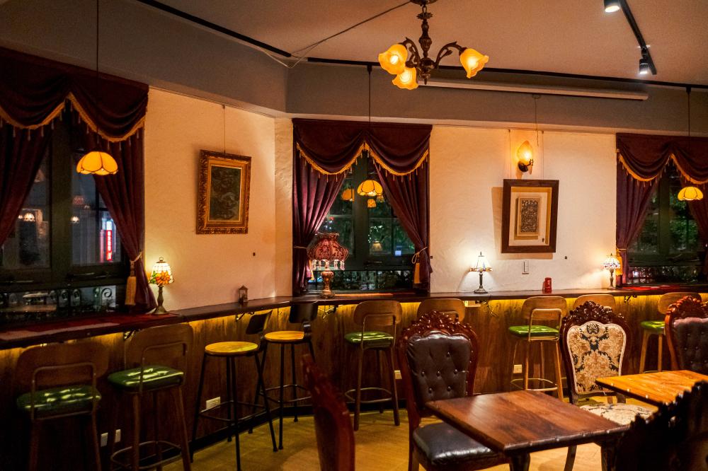 巷弄的騷動聲漸漸在轉角後退去,一扇深紅色木門靜靜地立著,藏著夜色裡才會展開的場景。推門而入,暖黃燈光在地板上灑落,磨舊的木質桌椅帶著時間打磨過的溫度。天花板垂落的老式吊燈、牆上泛著光澤的上海電影老海報、彷彿從舊時光裡抽取的窗框線條,串起一段屬於上一個年代的浪漫。吧檯後方的中藥櫃靜靜佇立,每一格似乎都封存著過往心事的氣味。空間裡流淌著微醺的甘甜——紅棗、枸杞與酒精交織。