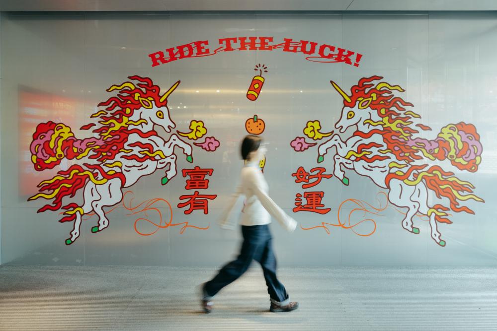 當大眾熟悉的春節傳統走入商場,會產生什麼樣的化學反應?今年春節,勤美 誠品綠園道邀請風格鮮明的藝術團隊「太陽龍宮」跨界合作,以「HEE HA 瘋馬戲」為主題,將傳統春節中常見的錦旗、祈福與許願等日常符碼重新拆解、轉譯,打造一場兼具視覺張力與幽默感的時髦新春慶典,為春節帶來全新的觀看方式與參與體驗。