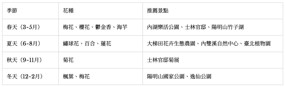 位於陽明山國家公園範圍內的陽明公園,是台北市區很好親近的山林風景。春天櫻花與杜鵑盛開時,滿山粉色與紫色交織;夏季時的涼爽氣溫更是避暑好去處;秋天可以觀賞芒花跟楓葉,冬天則建議安排泡湯與步道健行的輕旅行。提醒各位別忘了和園區內最具代表性的花鐘合照,隨季節更換的花卉造景四季皆美。