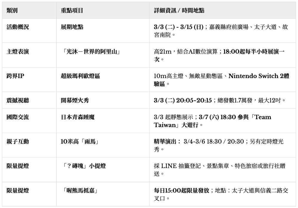 - 展出場域:串聯縣治特區、故宮南院、太子大道、府前廣場,打造國際級視覺饗宴,呈現嘉義厚的文化底蘊與創新能量。